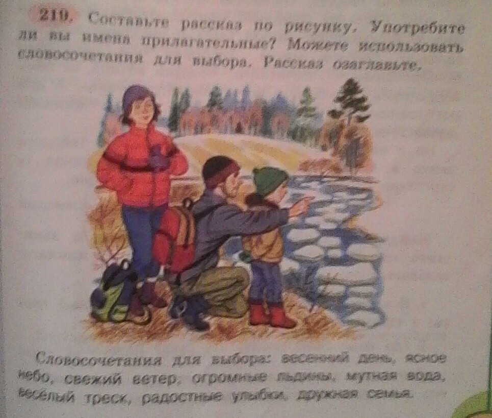 Хорошо в лесу! Сегодня прекрасный весенний день. Ясное небо над головой. Нет ни туч, ни облаков. Нам в лицо дует свежий ветер. Мы подошли к реке и увидели огромные льдины. Между ними мутная вода. Слышится веселый треск. На наших лицах выступают радостные улыбки. Мы дружная семья.