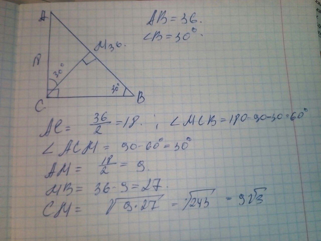 2) В прямоугольном треугольнике ABC, AB-гипотенуза, AB=36 см, угол B=30 градусов, СM-высота. Найти CM и AM.