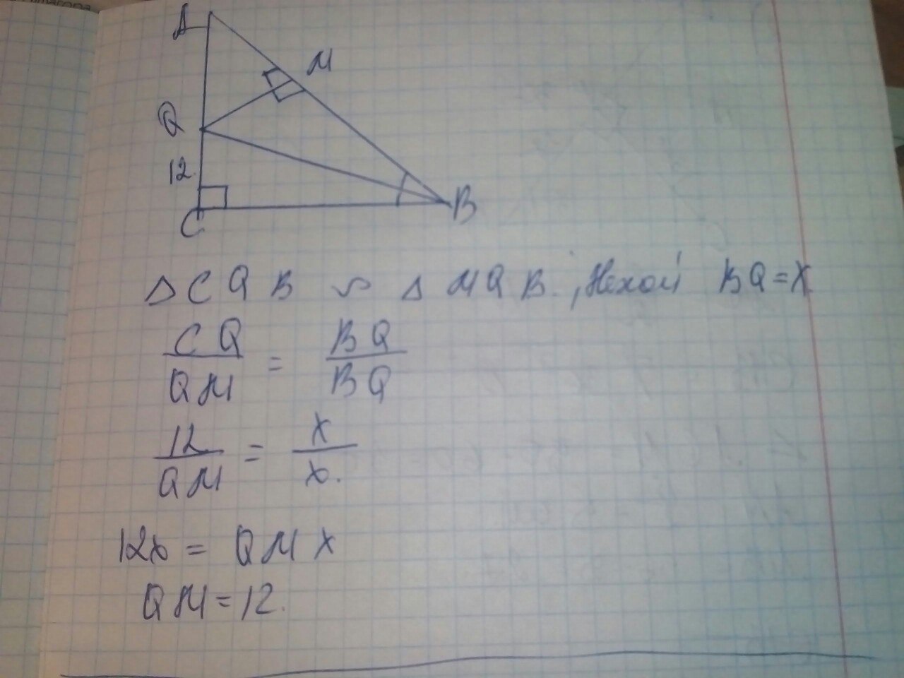 1) В прямоугольном треугольнике ABC, AB-гипотенуза, BQ-биссектриса, QM-высота треугольника BQA. Найти QM, если СQ=12 см.