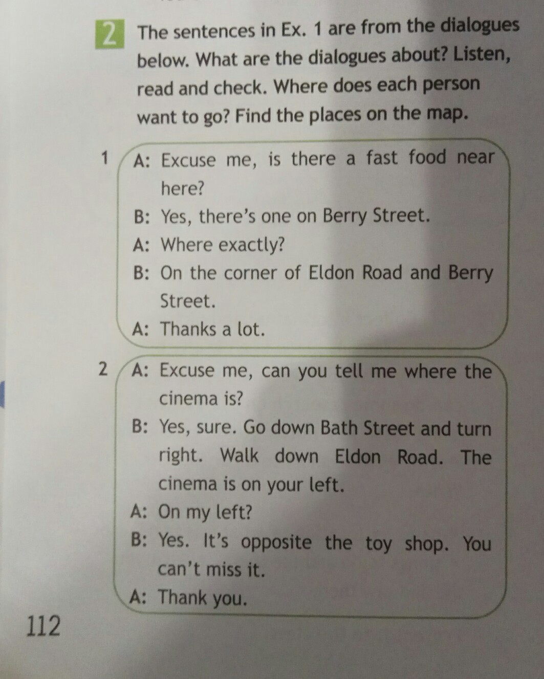 В первом диалоге : человек спрашивает где фаст фуд , и дяденька говорит что фаст фуд на берри стрит . Во втором диалоге человек говорит где кинотеатр тётя говорит : вниз по баз стриту потом на против к ишрушечнему магазину .