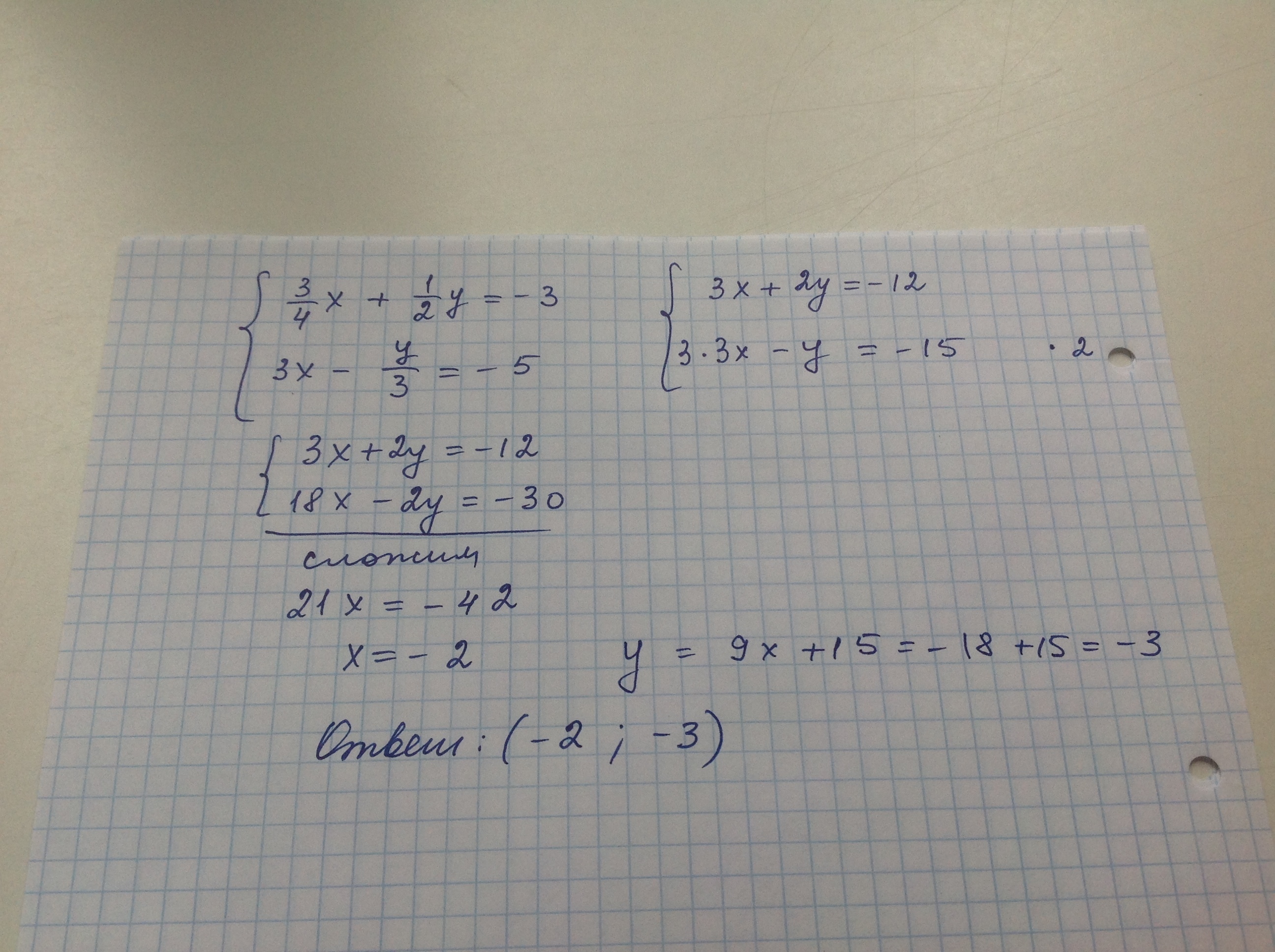 Решите систему уравнений {3/4х+1/2у=-3