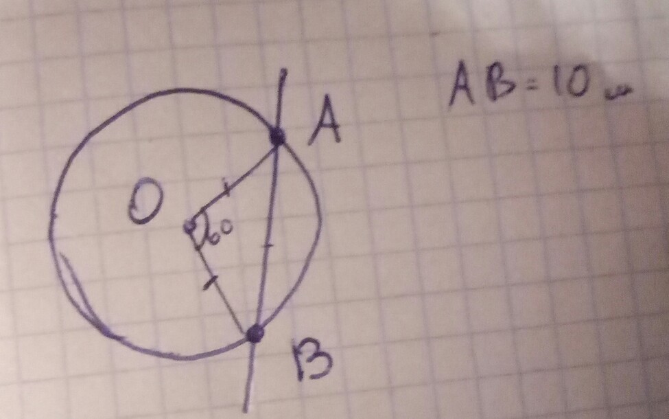Найти радиус круга с центром в точке O ,когда хорда AB проведенная в етом кругу имеет длину 10 см и угол AOB = 60 градусов
