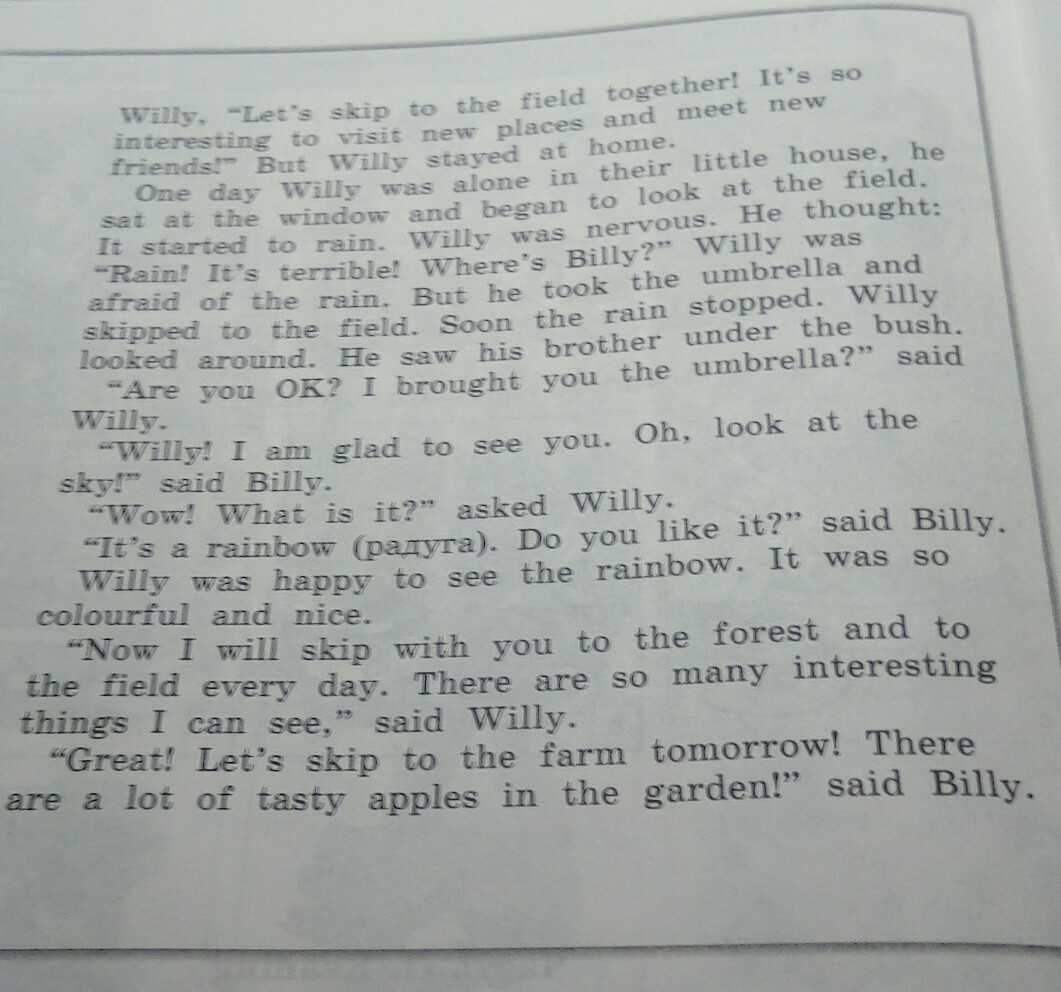 В один день Вилли был один в его маленьком домике. Он смотрел в окно. Вдруг начался дождь. Вилли стал нервничать. Он закричал: дождь! начался дождь! Где Билли? Вилли боялся дождя. Через некоторое время дождь кончился. Вили осмотрелся вокруг. (Дальше не могу перевести, сори).