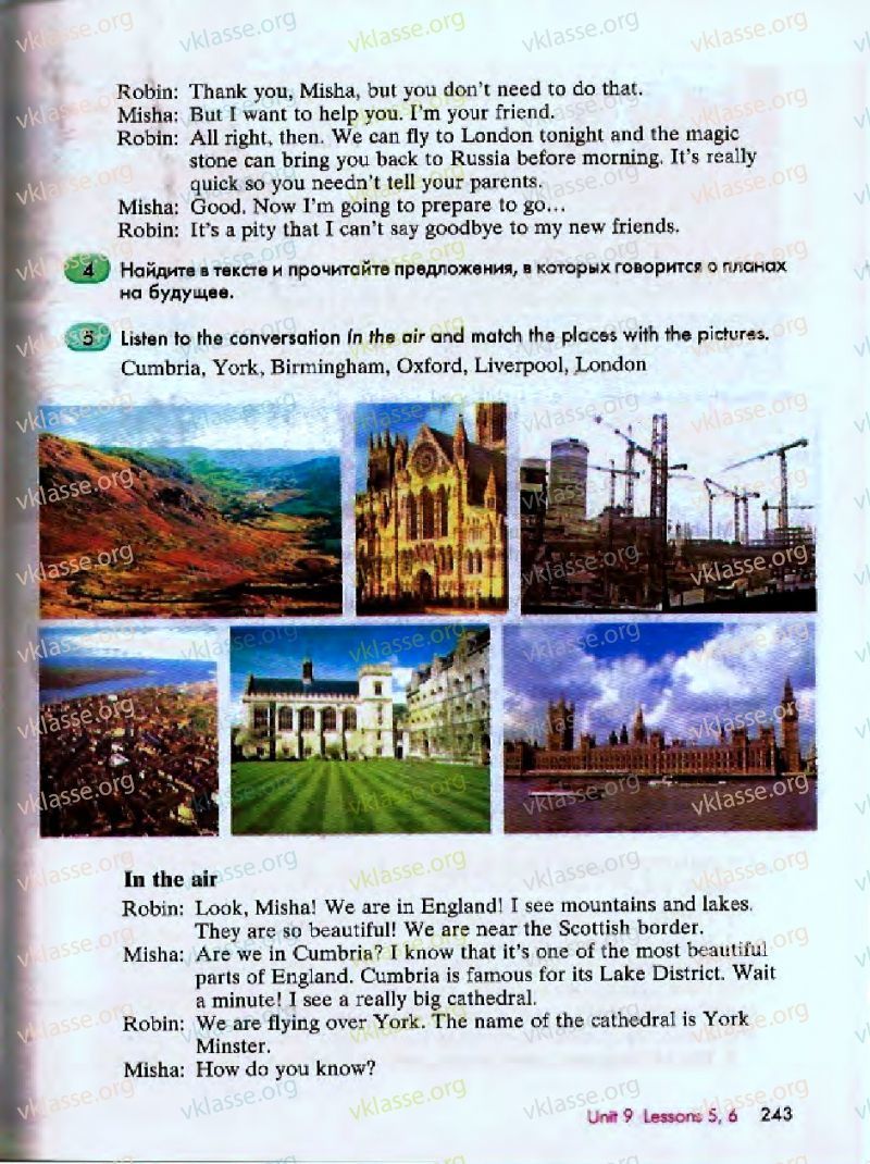 Робин:Миша: но я хочу помочь тебе. Я твой друг.Робин: хорошо, тогда. Мы можем вылететь в Лондон сегодня вечером и магиякамень может вернуть вас в Россию еще до утра. Это действительнобыстрая, поэтому вам не нужно сказать своим родителямМиша: Хорошо. Сейчас я собираюсь подготовиться к походу,Робин: очень жаль, что я не могу попрощаться с моими новыми друзьями,Найдите в тексте и прочитайте предложения, которых говорится О ПланахЛи.Послушайте разговор в воздухе и сопоставить с картинками.Камбрия, Йорк, Бирмингем, Оксфорд, Ливерпуль, Лондон\классВ воздухеРобин: Смотри, Миша! Мы в Англии! Я вижу горы и озераОни такие красивые! Мы находимся недалеко от шотландской границы.Миша:части Англии. Камбрия-это знаменитый #озеро район. Ждатьминуту! Я вижу огромный собор.ГСПРобин: мы летим над Нью-Йорк. Название собора-ЙоркеМинстер.Миша: откуда ты знаешь?9 Уроков ООН 5, 6