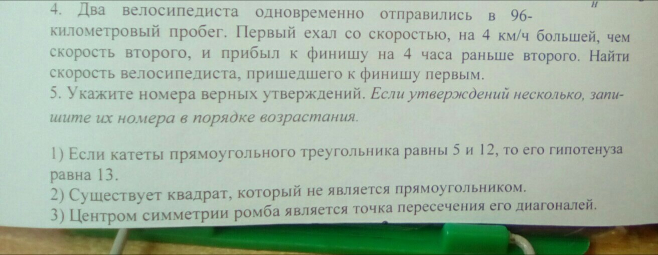 Теперь приравниваем 96/(х+4) и 96/х - 4. После преобразований получаем квадратное уравнение с корнями -12 и 8. -12 не удовлетворяет условий задачи, т.к. скорость не может быть отрицательной. Теперь, зная, что скорость первого = скорость второго + 4, находим, что 8+4=12.