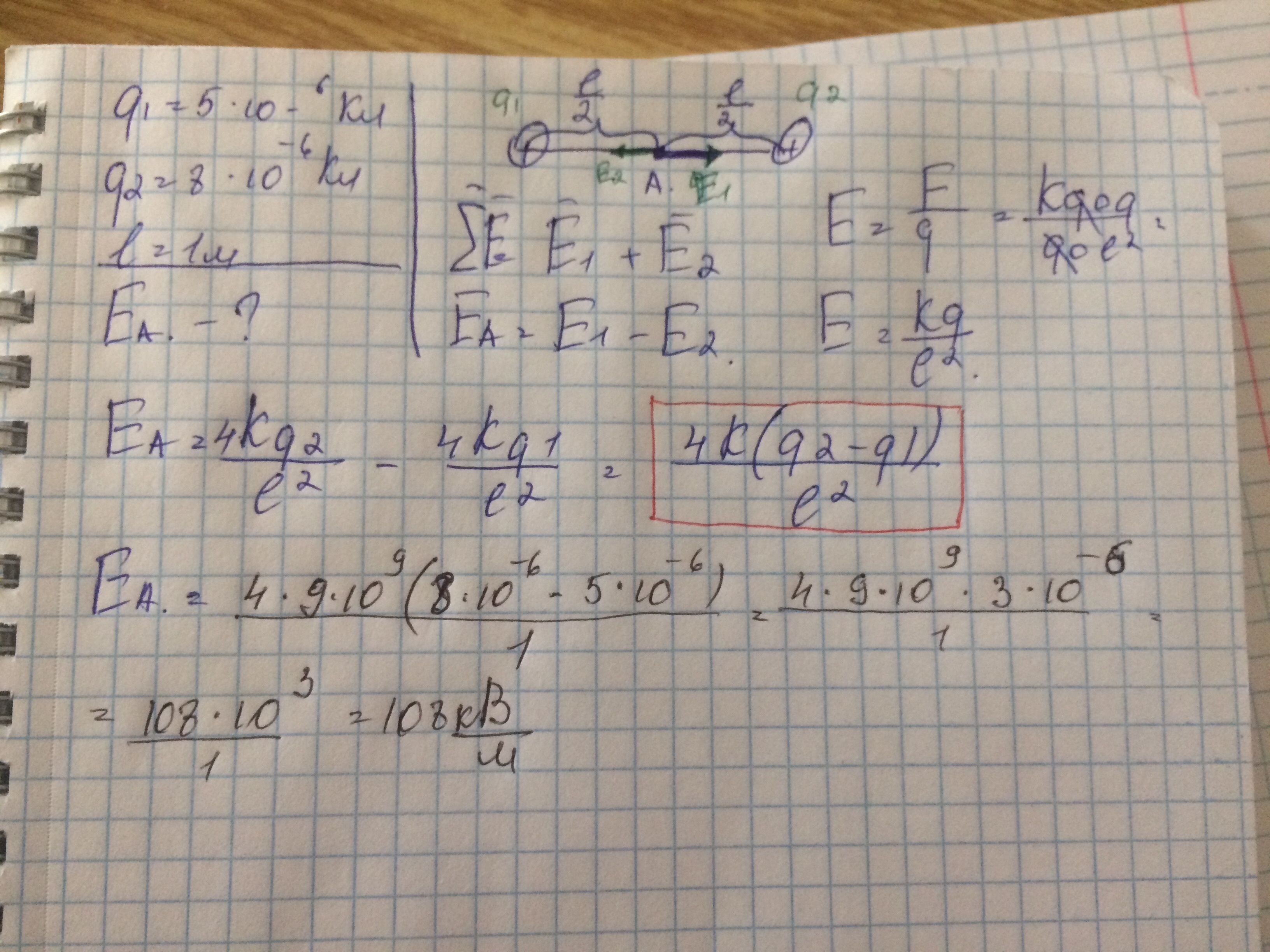 два заряда q1= 5 мккл и q2= 8 мккл находятся на расстоянии 1м друг от друга. Определить напряжённость поля в точке, расположенной посередине между ними.