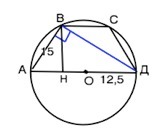 диагональ равнобедренной трапеции перпендикулярна боковой стороне, которая равна 15 см,. Найдите площадь трапеции, если радиус описанной окружности = 12,5 см