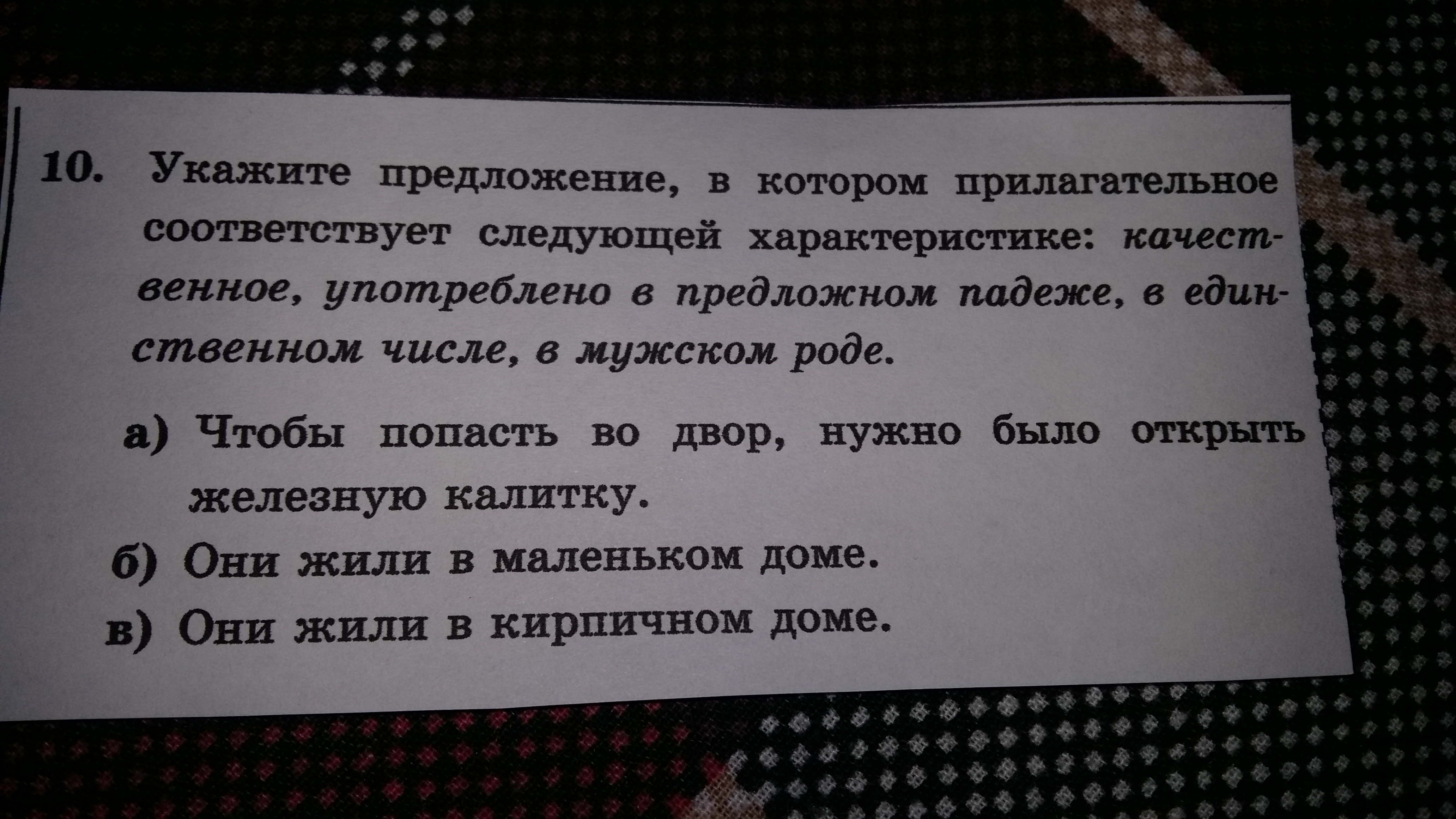 Укажите предложения,в котором прилагательное соответствует следующей характеристике:качественное,употреблено в предложном падеже,в ед инственном числе,в мужском роде. а)Чтобы попасть во двор,нужно было открыть железную калитку. б)Они жили в маленьком доме. в)Они жили в кирпичном доме