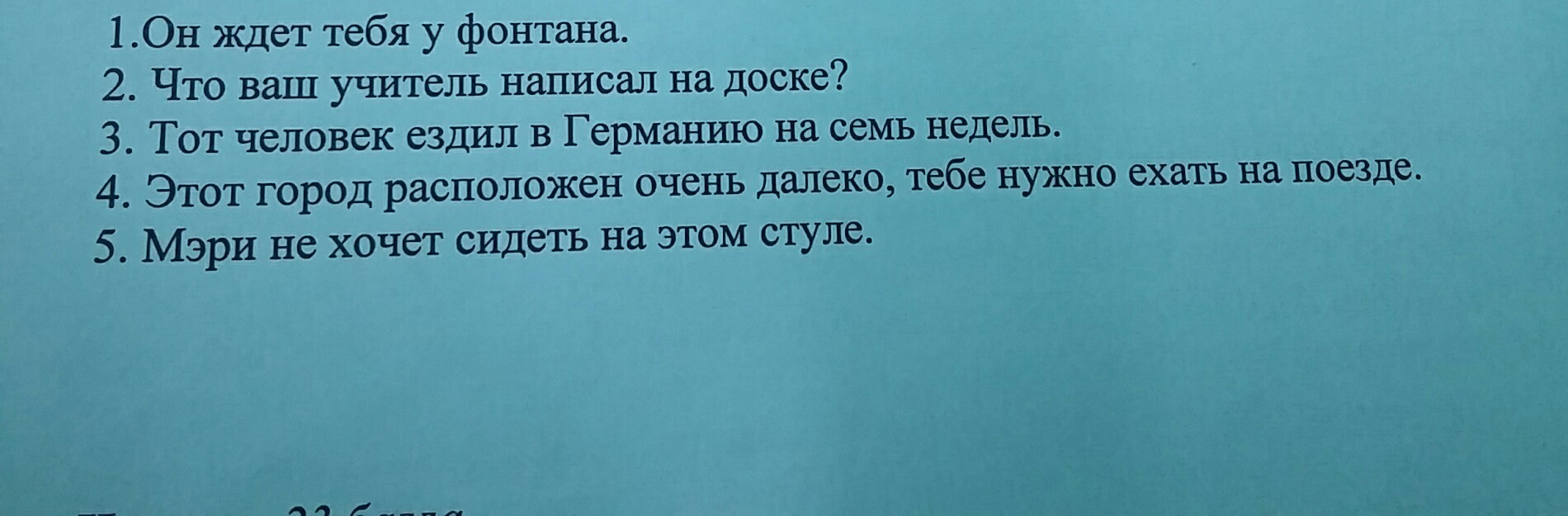 1. He is waiting for you at the fountain.2.What did your teacher write on the blackboard?3. That person went to Germany for seven weeks.4.This city is very far away, you need to go by train.5. Mary does not want to sit in this chair.