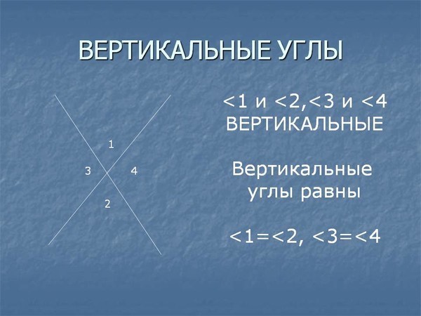 вертикальные углы равны. стороны вертикальных углов дополняют друг-друга до прямой.