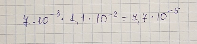 обычно при вычислениях подобных заданий надо сделать вычисления чисел между собой,действия с десятками между собой.Основания одинаковое 10,степени складываются.Потом ,если необходимо подвести под ответ можно перенести запятую влево (если степень минус) или вправо (если степень положительная)Так намного быстрее и проще.