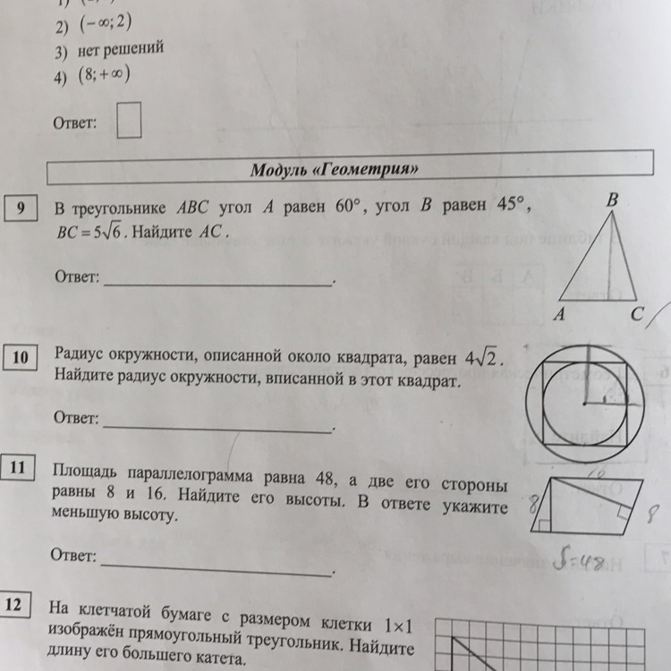 радиус можно провести от середины в угол квадрата(к описанной окружности)