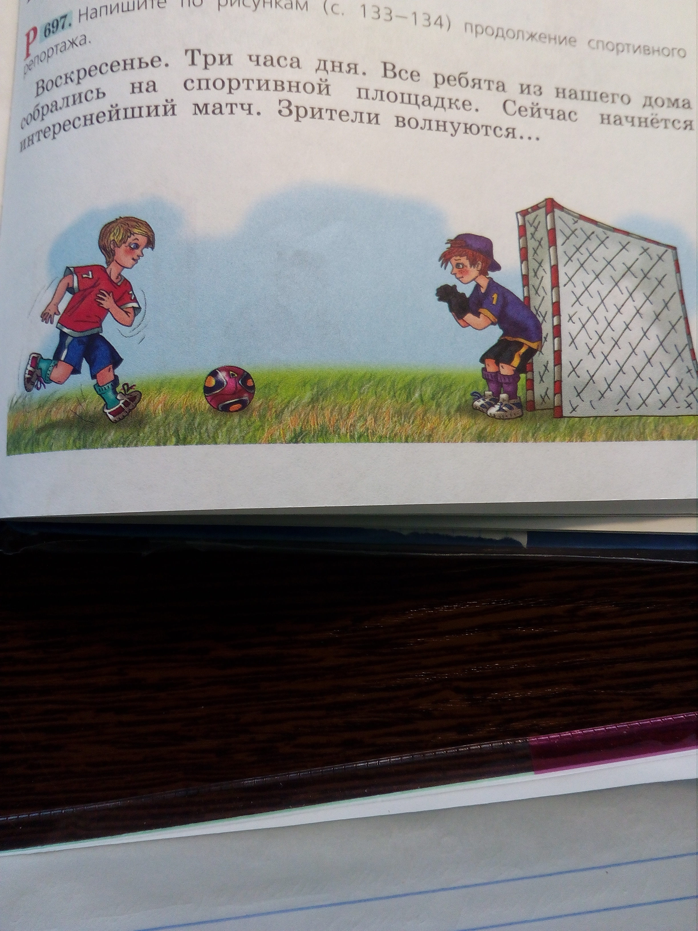 Помогите пожалуйста задание 697 напишите по рисункам продолжение спортивного репортажа. Воскресенье 3:00 дня все ребята из нашего дома собрались на спортивной площадке Сейчас начнётся интереснейший матч зрители волнуется