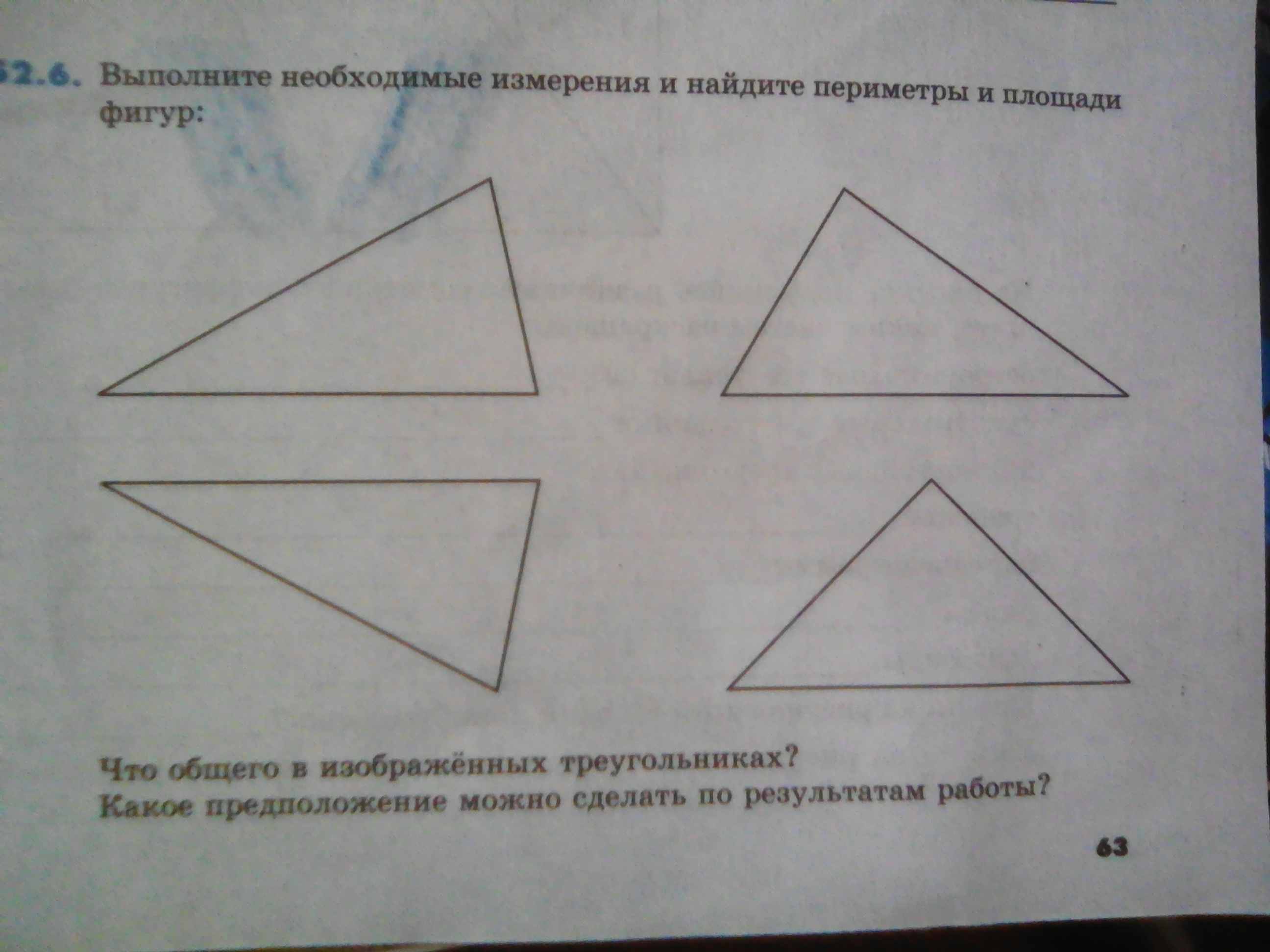 В этих треугольниках общий цвет форма и 3 угла периметр ты найдеш если измериш его стороны и сложиш а площадь если умножишь периметр на 2