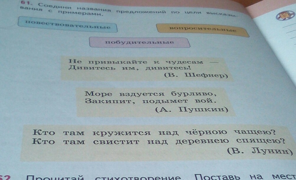 первый стих побудительный,второй стих повествовательный,третий стих вопросительный
