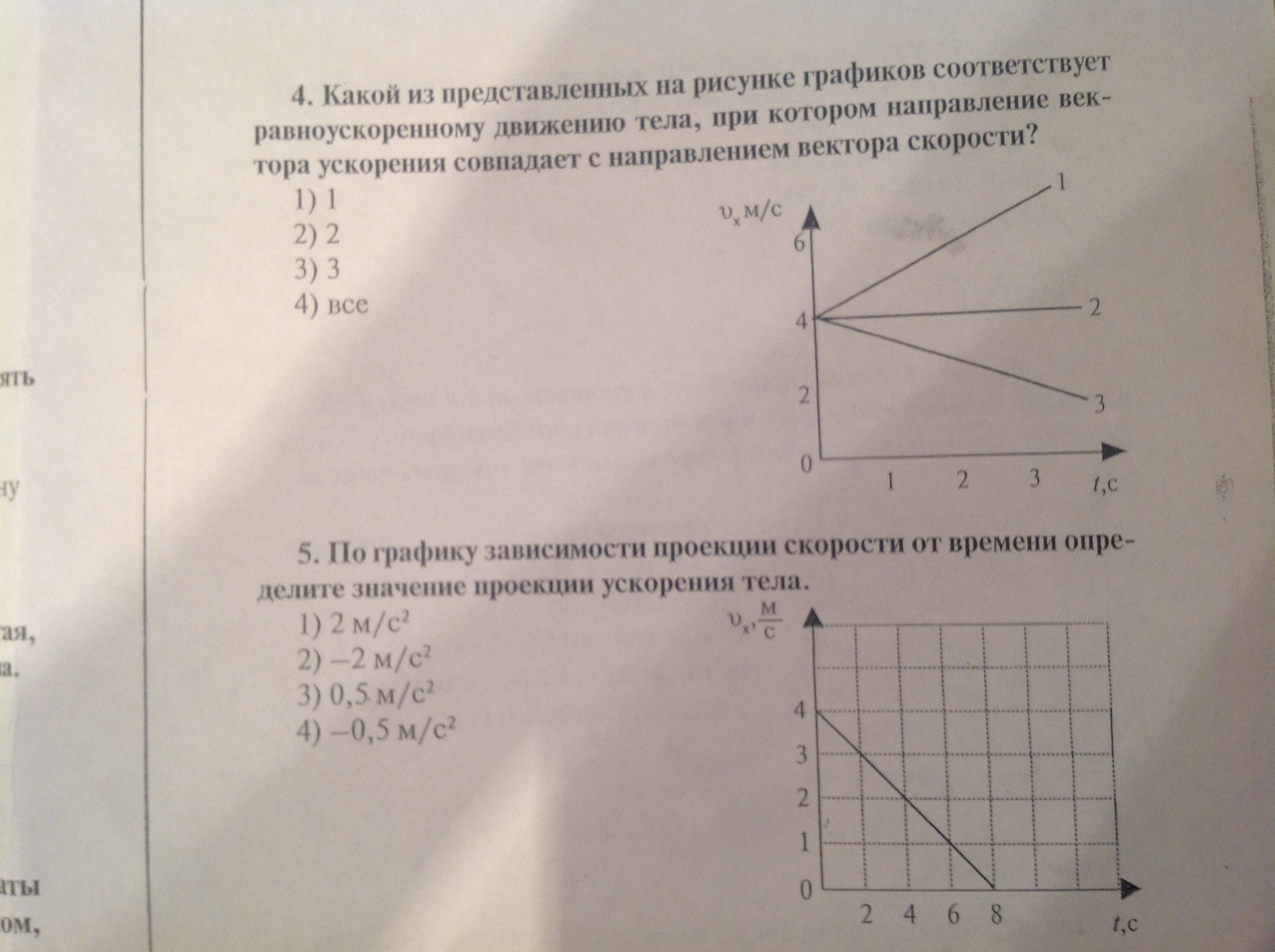 4. 1, т.к. при равноускоренном движении скорость возрастает(что мы и видим на графике). Вектор ускорения также сонаправлен с вектором скорости, поэтому скорость увеличивается.