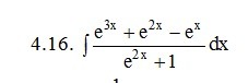int { frac{e^{3x} + e^{2x} - e^{x}}{ e^{2x} + 1}} , dx = {  e^{x} = t, e^{x}dx = dt, dx = dt/t } =  int { frac{t^{2} + t - 1}{1 + t^{2}} } , dt = int { frac{t^{2} + 1}{1 + t^{2}} } ,dt +  int { frac{t}{1 + t^{2}} } , dt - 2 int { frac{ 1 }{1 + t^{2}} } , dt = t + ln|1 + t^{2}|/2 - 2arctg(t) + C =  e^{x} +  ln|1 + e^{2x}|/2 - 2arctg( e^{x} ) + C