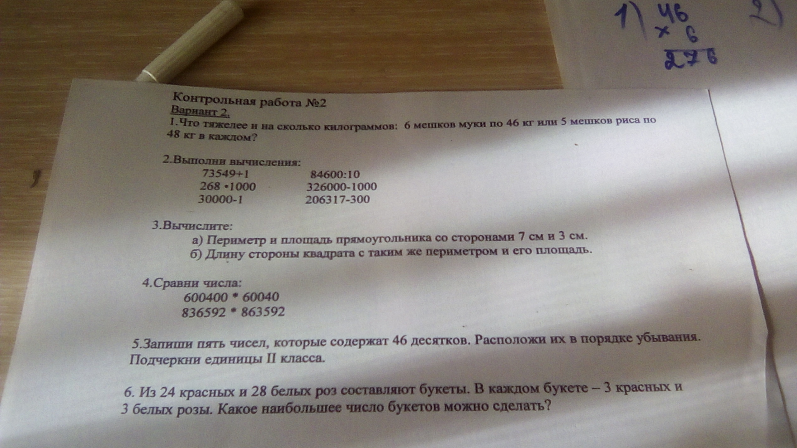 1) 6 мешков по 46 кг это 46*6=276 ( кг ) всего