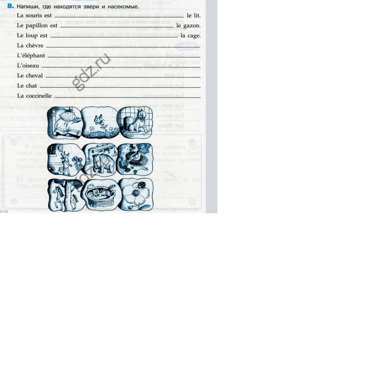 Мышка под кроватью. Бабочка на газоне. Волк в клетке. Коза перед домом. Слон на вокзале. Птица в гнезде. Лошадь за деревом. Кошка в корзинке. Божья коровка на цветке. (только я не расставила надстрочные знаки, у меня нет французской клавиатуры)