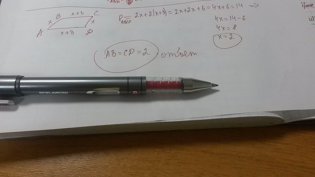 периметр параллелограмма ABCD равен 14 см,одна сторона на 3 см больше другой. Найдите меньшую сторону этого параллелограмма