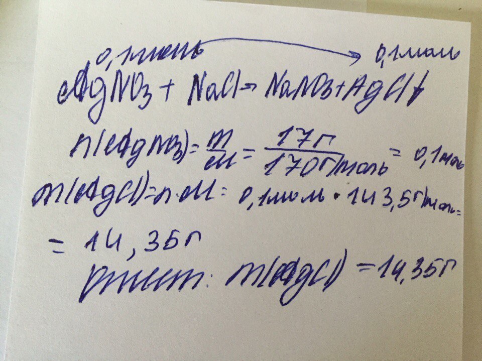 определить массу осадка который получится при взаимодействии нитрата серебра массой 17 г с избытком хлорида натрия. помогите пж, очень подробно