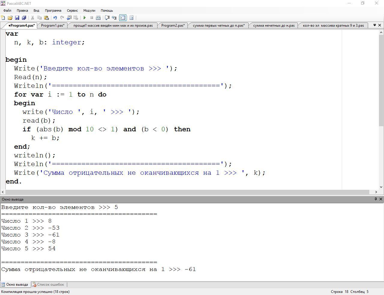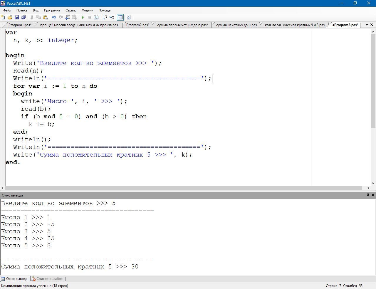 1)для n челых чисел, введенных с клавиатуры, найти сумму положительных чисел кратных 5