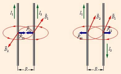 При силе тока направленной в разные направления замечается отталкивание, в одинаковые же притяжение