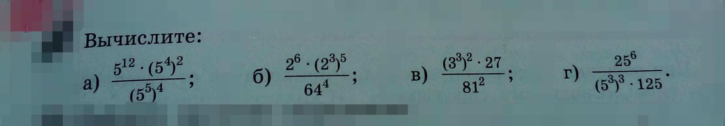 г) 5^12/5^9*5^3=5^12/5^12=1