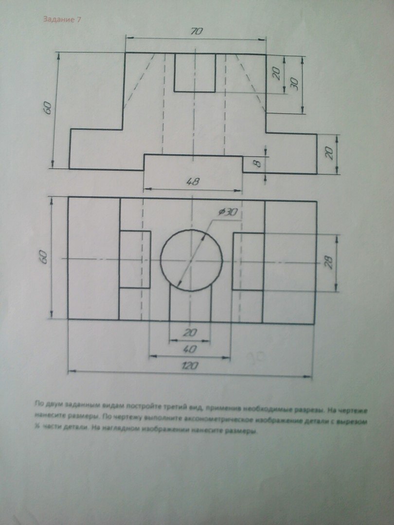 По двум заданным видам детали постройте третий, применив необходимые разрезы. Помогите, пожалуйста!!!