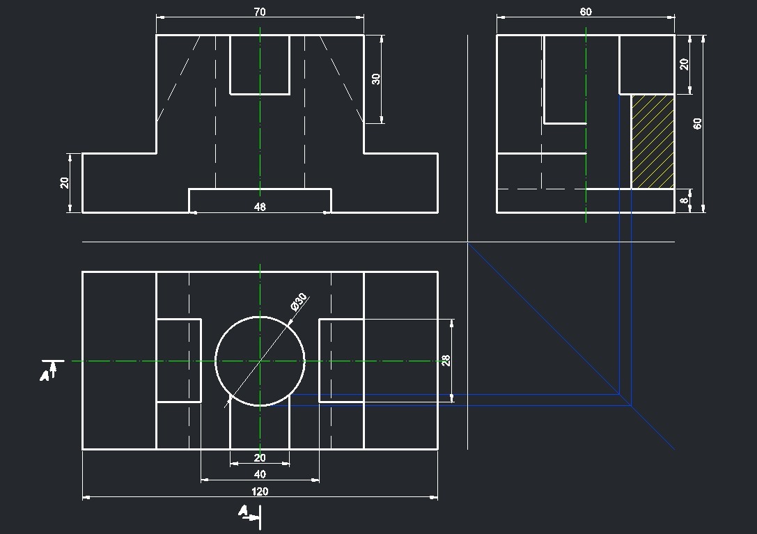 Синие линии, это вспомогательные линии, с их помощью, вы найдете проекцию выреза детали, на виде слева. Их можно не строить, а можно тоненькими линиями прочертить.