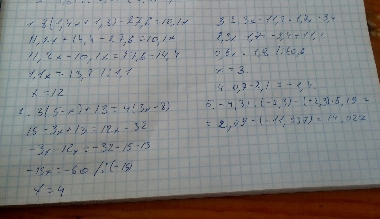 №3 2,3x-11,2-1,7x+9,4=0, 0,6x-1,8=0, 0,6x=1,8, x=1.8/0.6, x=3