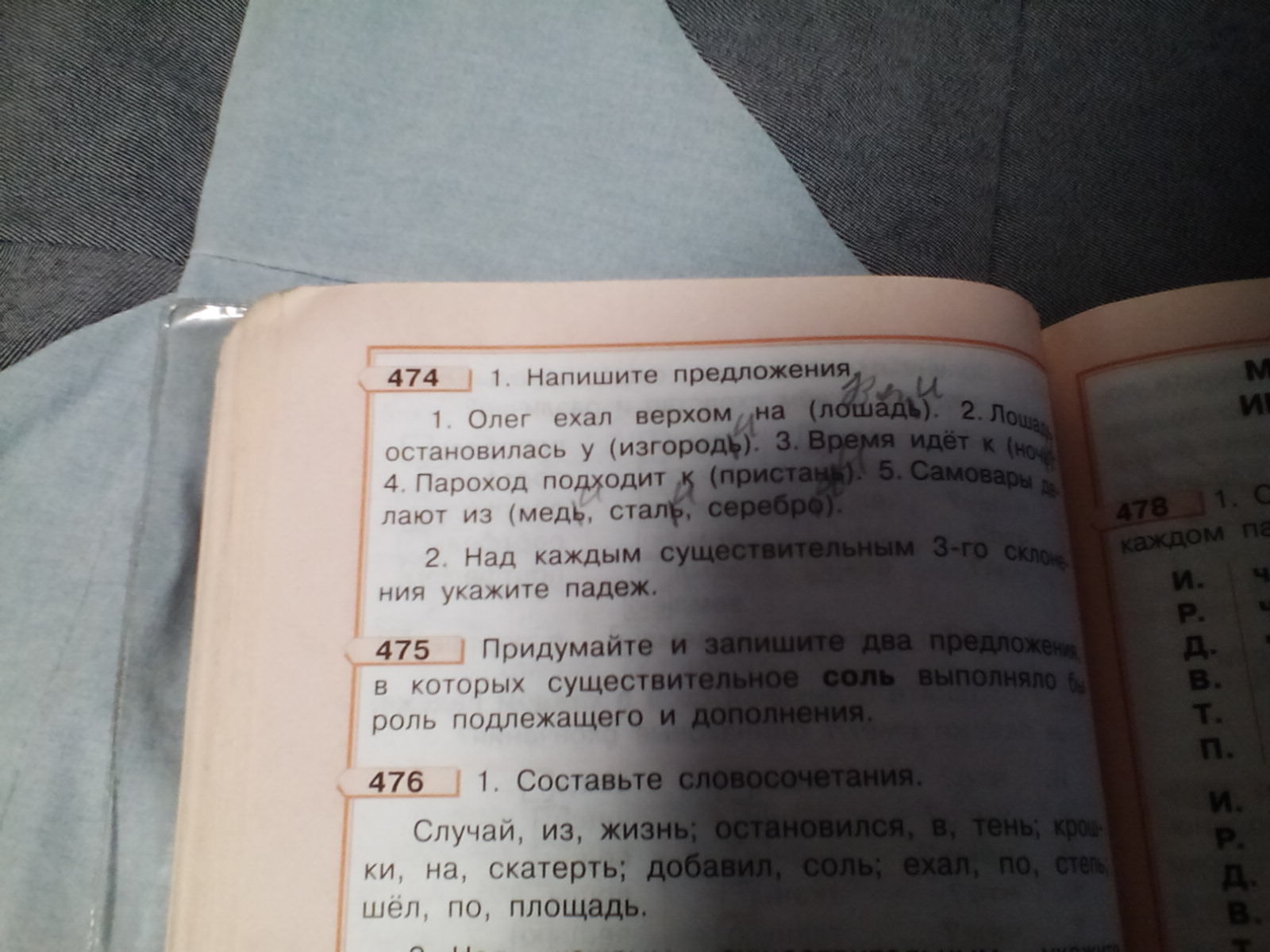 1) Олег ехал верхом на лошади (П.п.) 2) Лошадь остановилась у изгороди (Р. п.) 3) Время идёт к ночи (Д. п.) 4) Пароход подходит к пристани (Д. п.) 5) Самовары делают из меди, стали, серебра (Д.п)