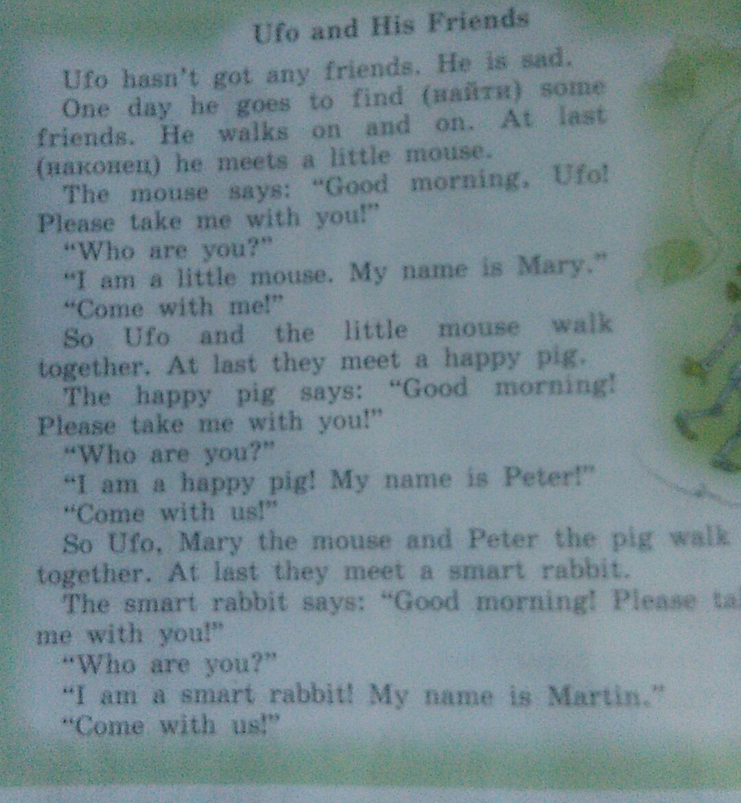 у летающей тарелки нету друзей. Она была грустной. В один день она захотела найти друзей. она шла вперёд и вперёд. в конце она встретила маленькую мышку. мышка сказала: доброе утро, летающая тарелка. пожалуйста возьми меня с собой. кто ты? я маленькая мышка меня зовут Мэри. пошли со мной. так летающая тарелка и мыленькая мышка пошли вместе. в конце они встретили счастливого поросёнка. счастливый поросенок сказал: доброе утро! пожалуйста, возьмите меня с собой. кто ты? мое имя Петя. пошли с нами! так летающая тарелка, маленькая мышка и петя свинка шли вместе. в конце они встретили умного кролика. умный кролик сказал доброе утро! возьмите меня с собой. кто ты? я умный кролик моё имя Мартин. пошли с нами.