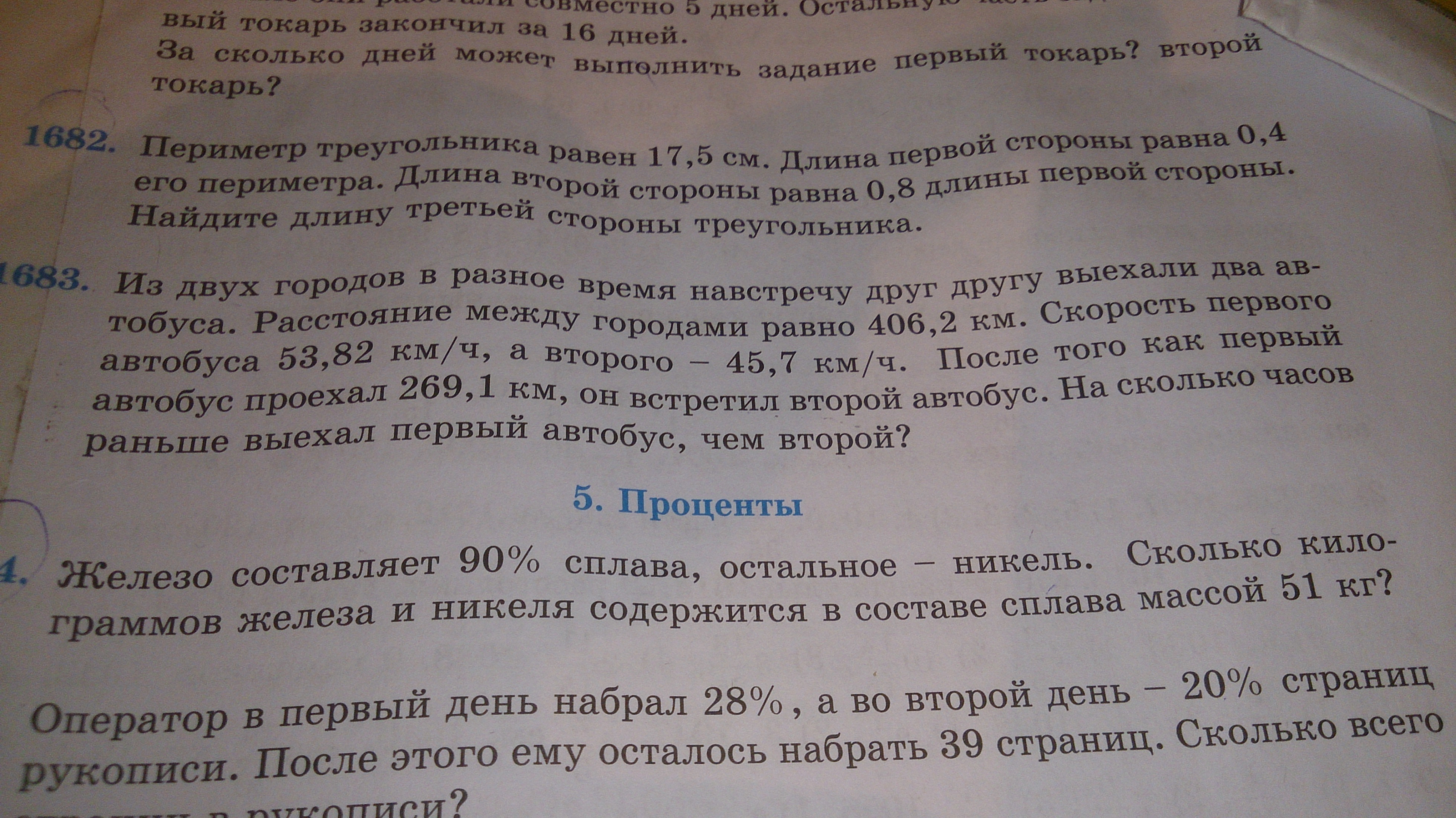 1)406,2-269,1=137,1(км)проехал второй;2)269,1:53,82=5(ч)был в пути первый;3)137,1:45,7=3(ч)был в пути второй;4)5-3=2(ч)раньше выехал первый автобус