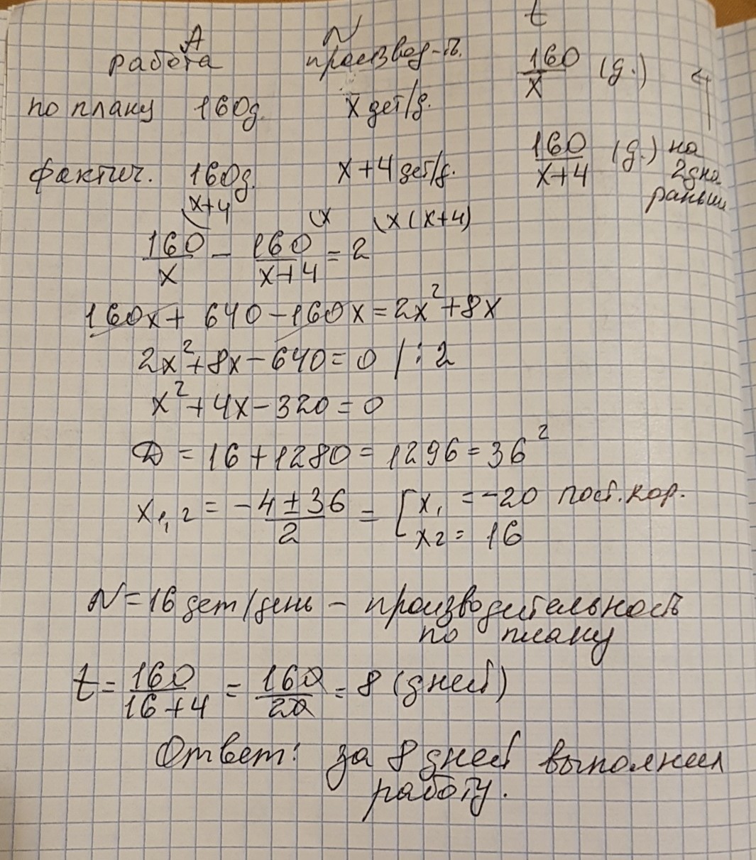 Рабочий должен был за определенное время изготовить 160 деталей. Ежедневно он изготавливал на 4 детали больше ,чем планировал , и закончил работу на 2 дня раньше срока. За сколько дней он выполнил работу ?