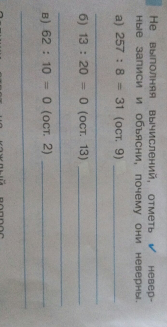 257:8=31 (ост. 9)- неверен. Так как остаток не может быть больше делителя. 257:8=32 (ост. 1)
