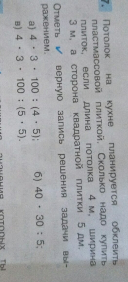 потолок на кухне планируется обклеить пластмассовой плиткой Сколько надо купить прыгать если длина потолка 4 метра ширина 3 метра сторона квадратной плитки 5 дециметров Отметь галочкой верную запись решения задачи выражением