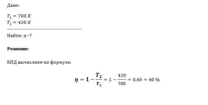 Температура нагревателя идеальной машины Карно 700 К, а температура холодильника 420 К. Каков КПД идеальной машины?