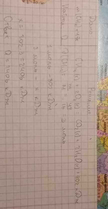 1. Согласно термохимическому уравнению реакции CH4(г) + 2O2(г) = CO2(г) + 2H2O(г) + 802 кДж вычислите количество теплоты, выделившейся при сжиганий 48 гр. метана