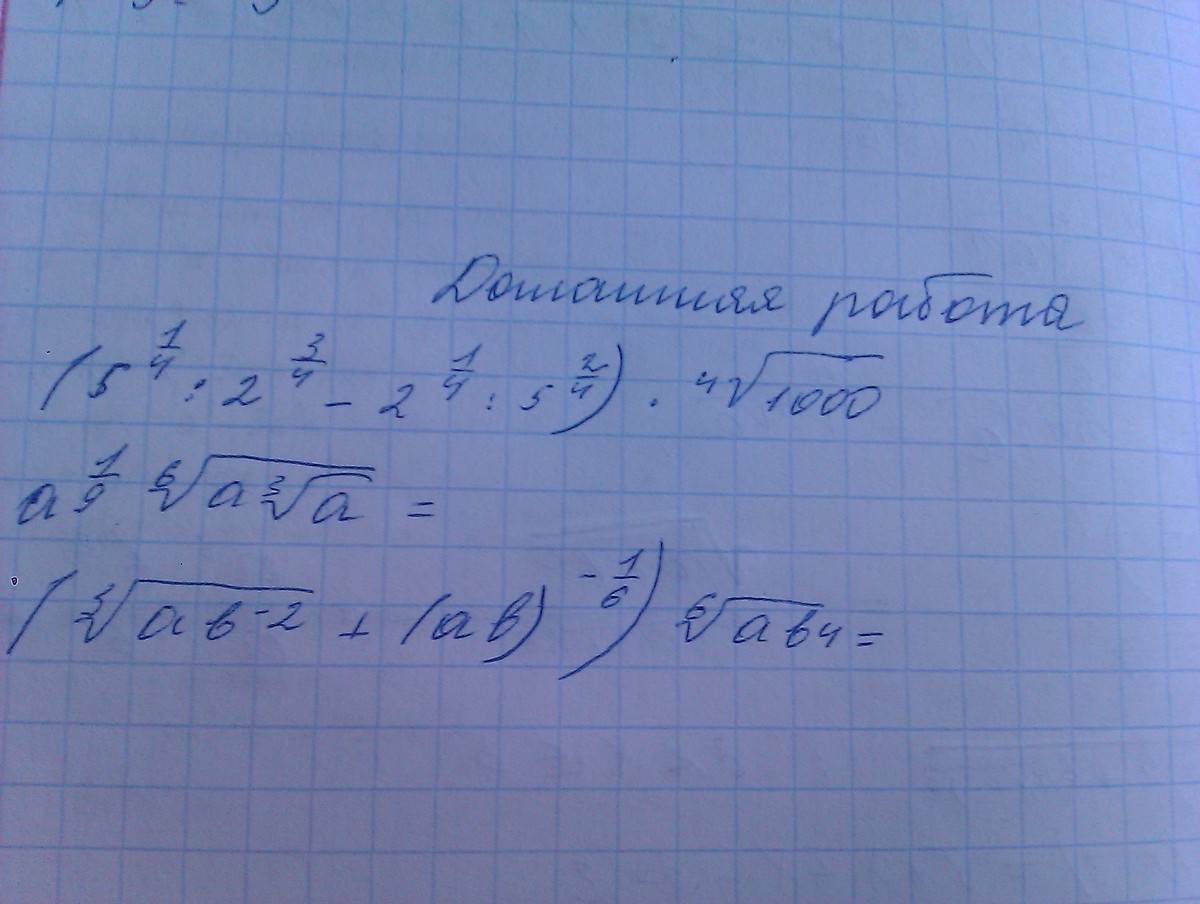 1) (5^frac{1}{4}:2^frac{3}{4}-2^frac{1}{4}:5^frac{2}{4})cdot sqrt[4]{1000}=(frac{5^frac{1}{4}}{2^frac{3}{4}}-frac{2^frac{1}{4}}{5^frac{3}{4}})cdot 10^frac{3}{4}=frac{5^frac{1}{4}cdot 5^frac{1}{2}-2^frac{1}{4}cdot 2^frac{3}{4}}{2^frac{3}{4}cdot 5^frac{3}{4}}cdot 10^frac{3}{4}=\=frac{5^frac{3}{4}-2^frac{4}{4}}{10^frac{3}{4}}cdot 10^frac{3}{4}=5^frac{3}{4}-2=sqrt[4]{5^3}-2\2)a^frac{1}{9}sqrt[6]{a^3sqrt[3]{a}}=a^frac{1}{9}sqrt[6]{a^frac{10}{3}}=