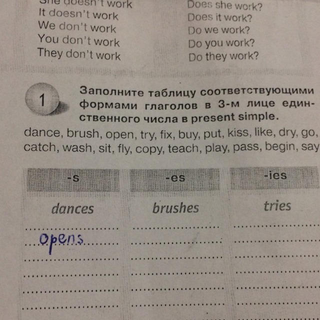 В вторую колонку: Fixes, Kisses, Goes, Catches, Washes, Teaches, Passes.