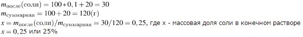 К 100 г. 10-процентного раствора соли добавили 20г этой же соли.Чему равна массовая доля соли в полученном растворе