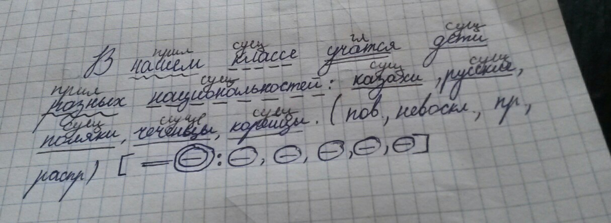 Кто дети- подлежащие, дети что делают учатся-сказуемое, разных-определение, национальностей-дополнение, казахи, русские, поляки, чеченцы, корейцы дополнение, в нашем классе- обстоятельство