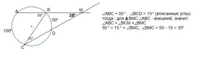 хорди АВ і СD кола не перетинаються, а прямі AB і CD перетинаються в точці M. знайдіть кут AMC якщо дуга AC=100 градусів дуга BD=30 градусів.