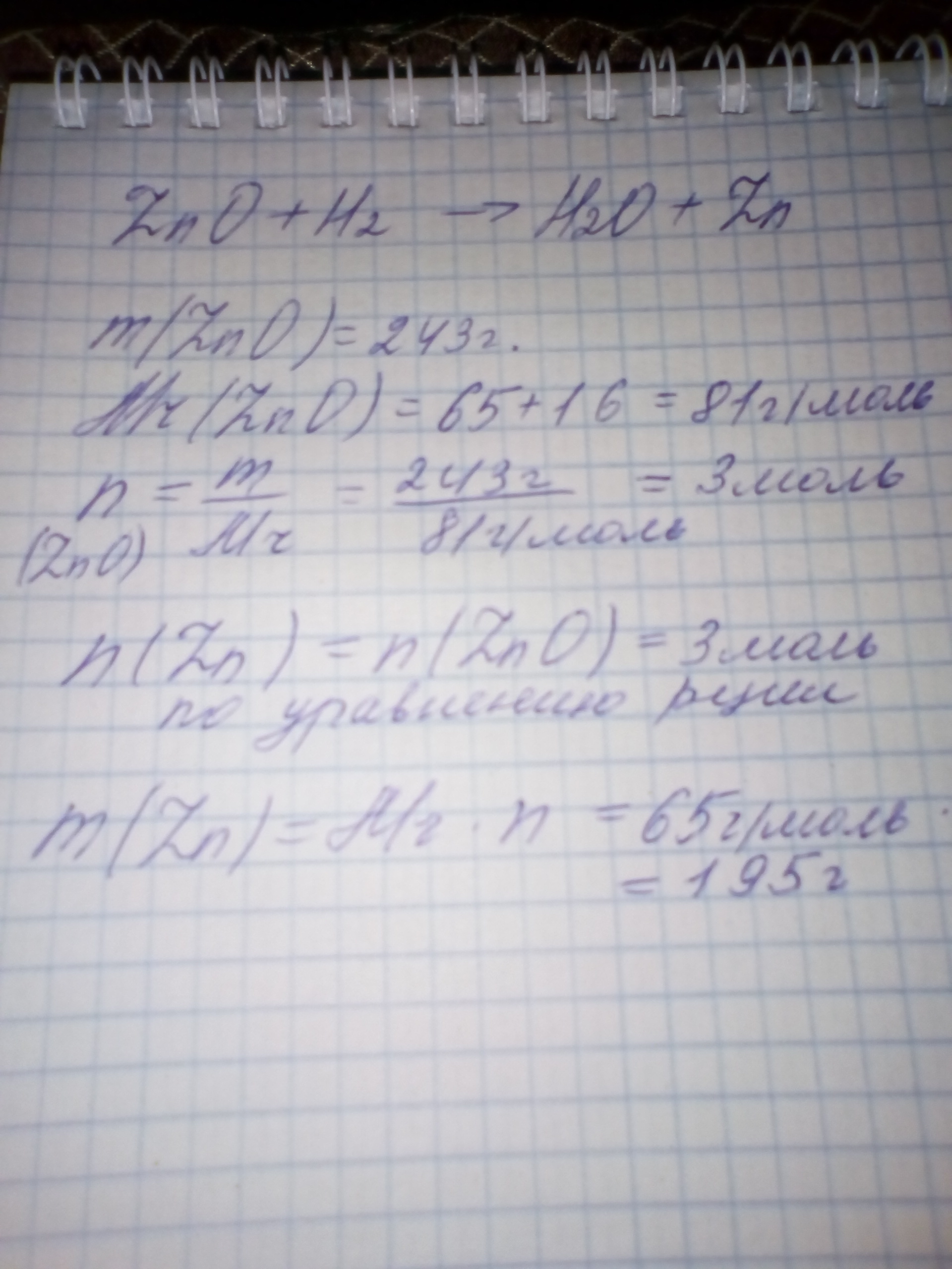 Рассчитайте, какую массу цинка можно получить при восстановлении водором 243 г оксида цинка (2 валентность )