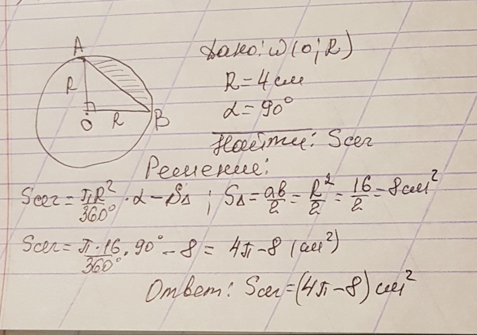 Найти площадь сегмента, если радиус равен 4 см, а дуга содержит 90 градусов.