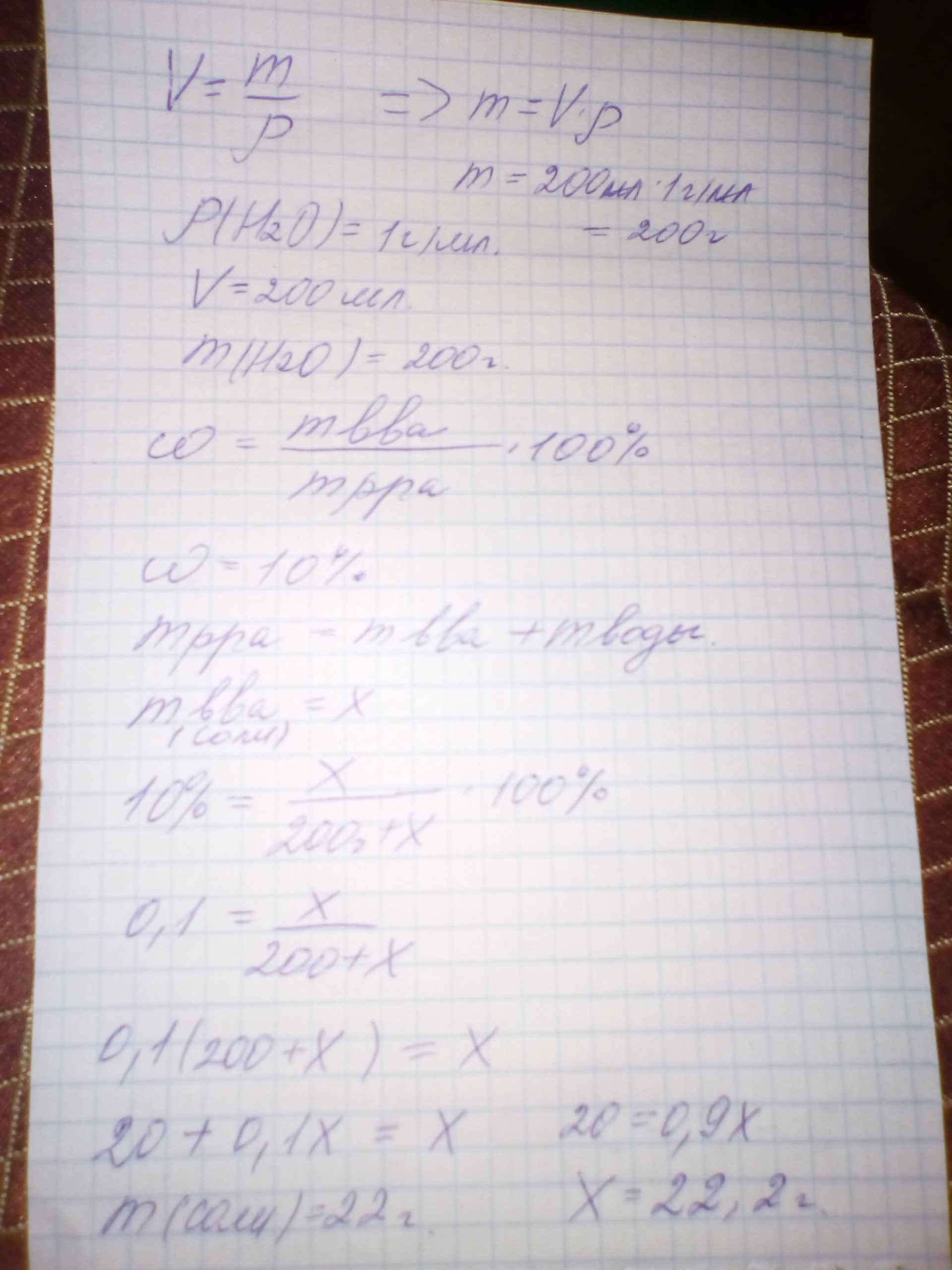какую массу соли нужно растворить в 200 мл воды, чтобы получить раствор с массовой долей соли 10%?