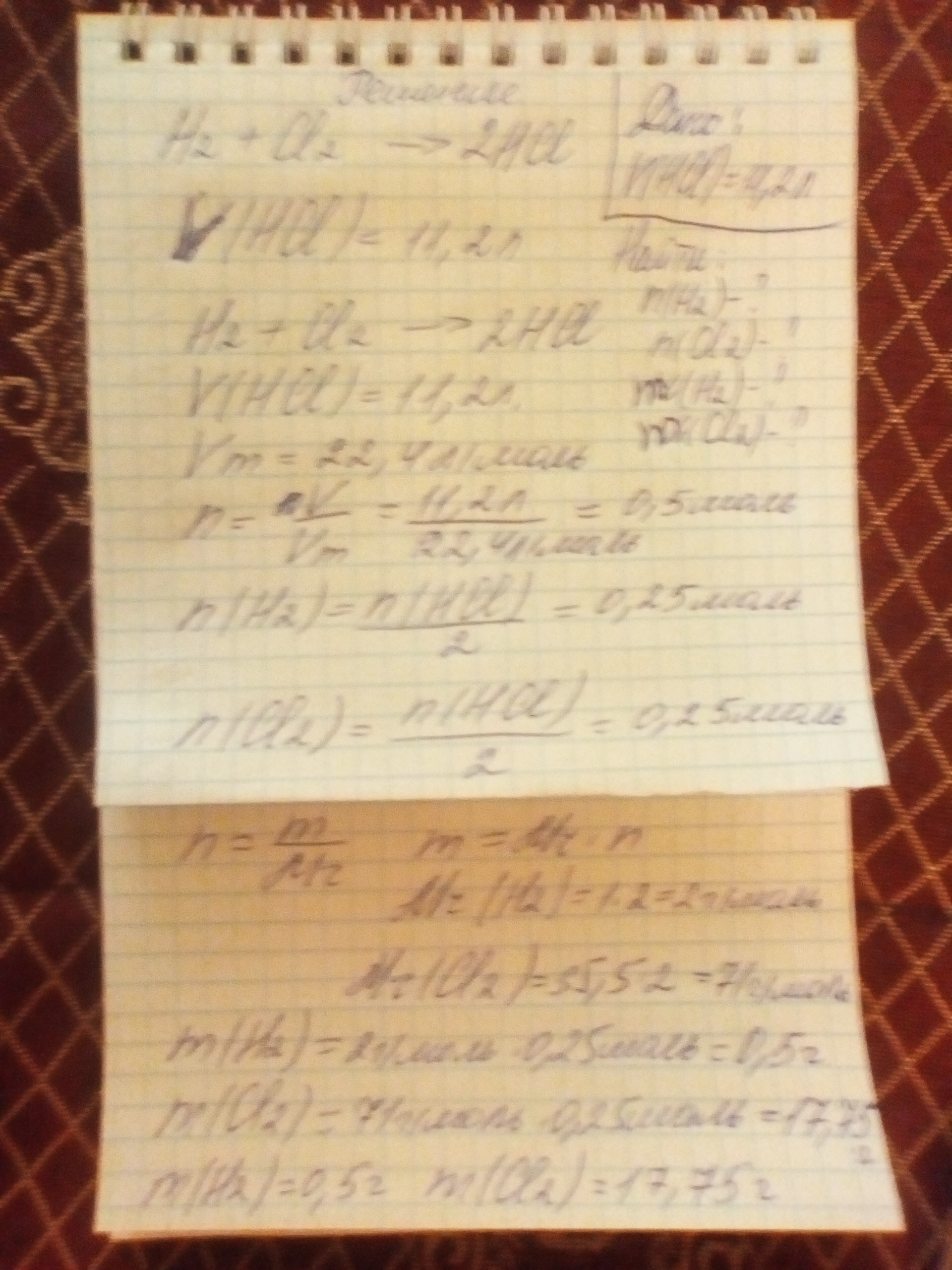 Дано: V(HCL)=11,2 л. Найди: n(H2)-? n(CL2)-? m(H2)-? m(CL2)-? Pешение. H2+CL2=2HCL. n(HCL)=V/Vm. Vm=22.4л/моль. При н. у нормальных условиях. n=11,2л/22.4л/моль=0.5моль. n(H2)=n(HCL)/2=0.5:2=0.25моль. m(H2)=Mr*n=2г/моль*0.25моль=0.5г. n(CL2)=n(HCL)/2=0.5моль:2=0.25моль. m(CL2)=Mr*n=71г/моль*0.25моль=17,75г