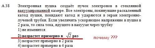 Электронная пушка создаёт пучок электронов в стеклянной вакуумированной камере. Все электроны, покинувшие раскаленный катод пушки, покидают катод и ударяются в экран электронно-лучевой трубки. Если увеличить ускоряющее напряжение в пушке в 2 раза, то сила тока, идущего в вакууме через трубку