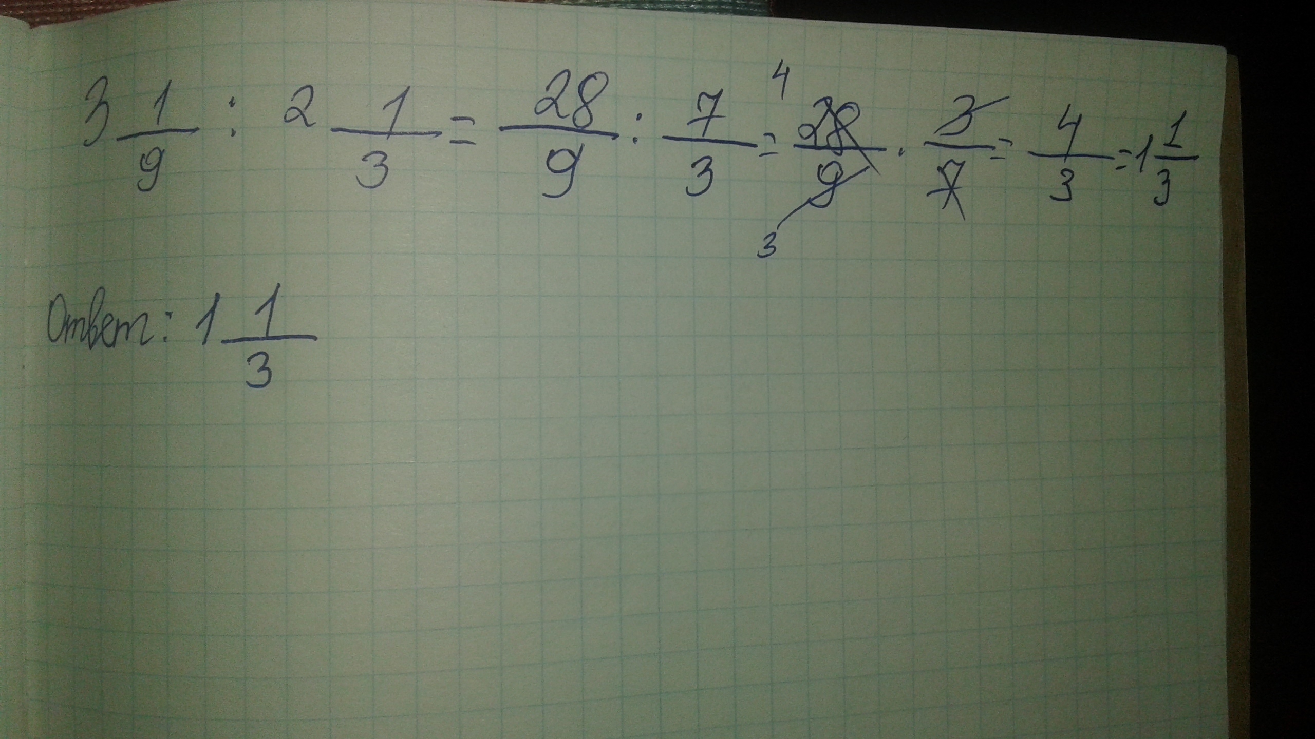 3;1/9÷2;1/3=28/9÷7/3=28/9*3/7=4/3=1;1/3